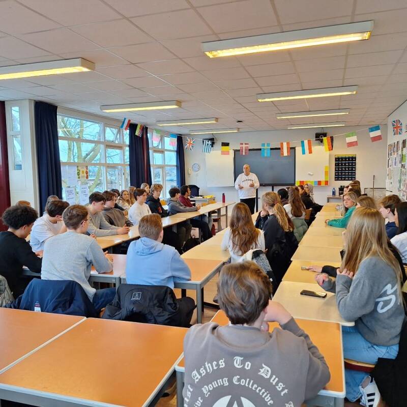 62 leerlingen zaten op hun stoel met open mond te luisteren naar zijn verhaal. Hij ging geen vraag uit de weg en ging rustig de discussies aan met de leerlingen.